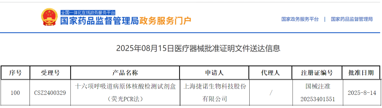 8月14日,国药集团中国生物上海捷诺生物科技股份有限公司(以下简称“中生捷诺”)研发的“十六项呼吸道病原体核酸检测试剂盒(荧光PCR法)”通过国家药品监督管理局(NMPA)注册审批,获得三类医疗器械注册证。该产品可以实现在一次实验中同时检测十六种常见的呼吸道感染病原体。